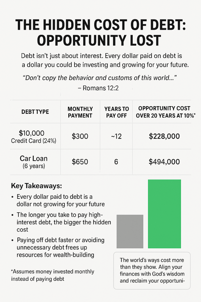 When it comes to money, this verse has profound implications. Many people focus only on the obvious cost of debt—the interest—but fail to see the hidden cost: the opportunities they sacrifice while making payments. Every dollar spent servicing debt is a dollar that cannot be invested, saved, or used to grow one’s financial future. Over time, the opportunity cost of debt can far exceed the interest itself, limiting your ability to build wealth, prepare for emergencies, or pursue life-giving goals.